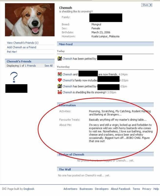 I was only being 'technical'. In fact, I was referring to my younger brother's pet dog. Recently, he sent me a message on a Facebook and apparently, he had signed up the bitch on her behalf on Facebook. Check out the part where I have circled: